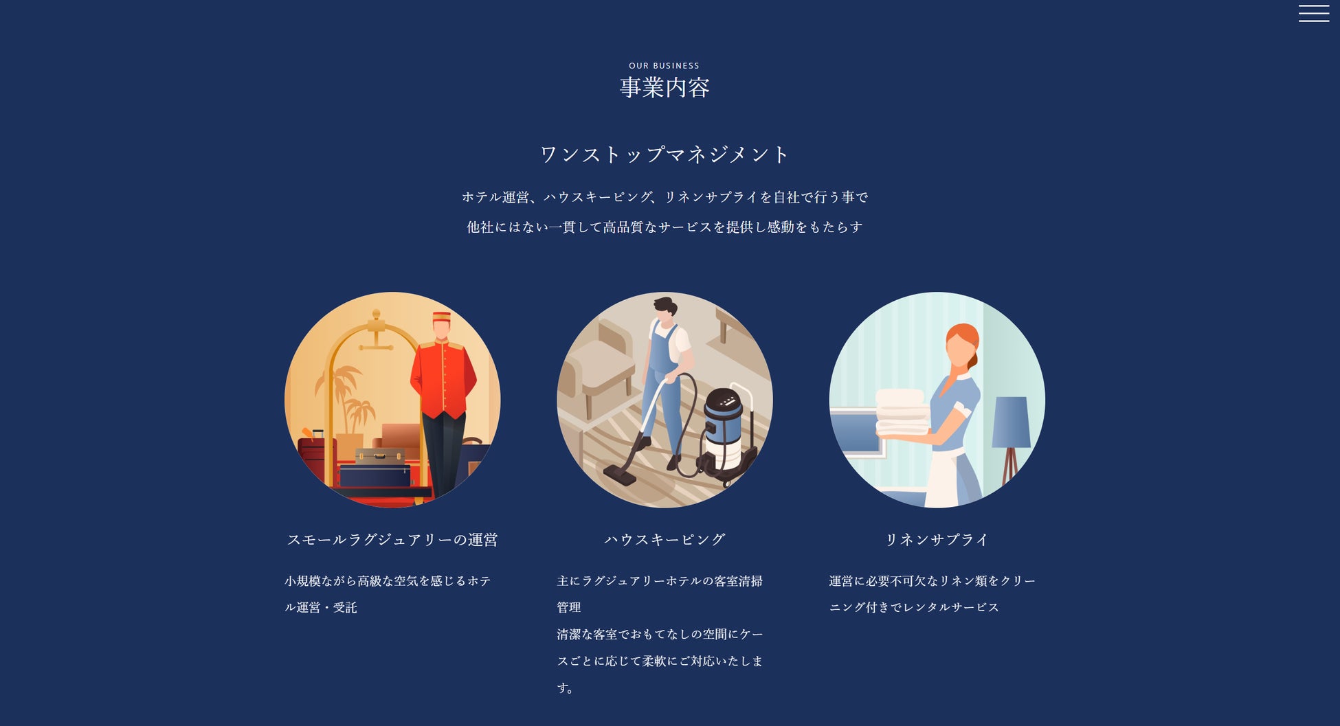 スモールラグジュアリーホテルの運営からハウスキーピング、リネンサプライと一貫して滞りなく、自社で実行することをご紹介しています。