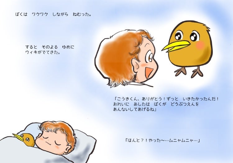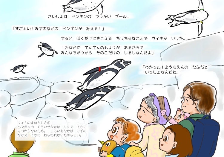 キーウィのぬいぐるみ「ウィキ」と一緒に、天王寺動物園を訪れたところ、突然ウィキがしゃべり始めて、いろいろな動物を見ながら生態や雑学を次々と教えてくれるーという内容です。