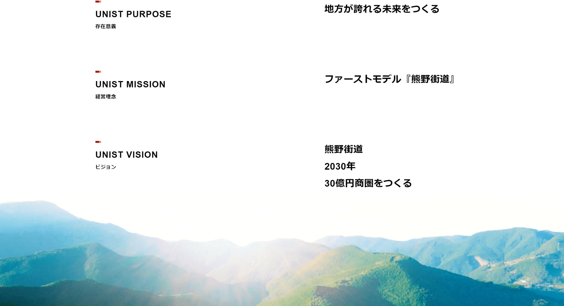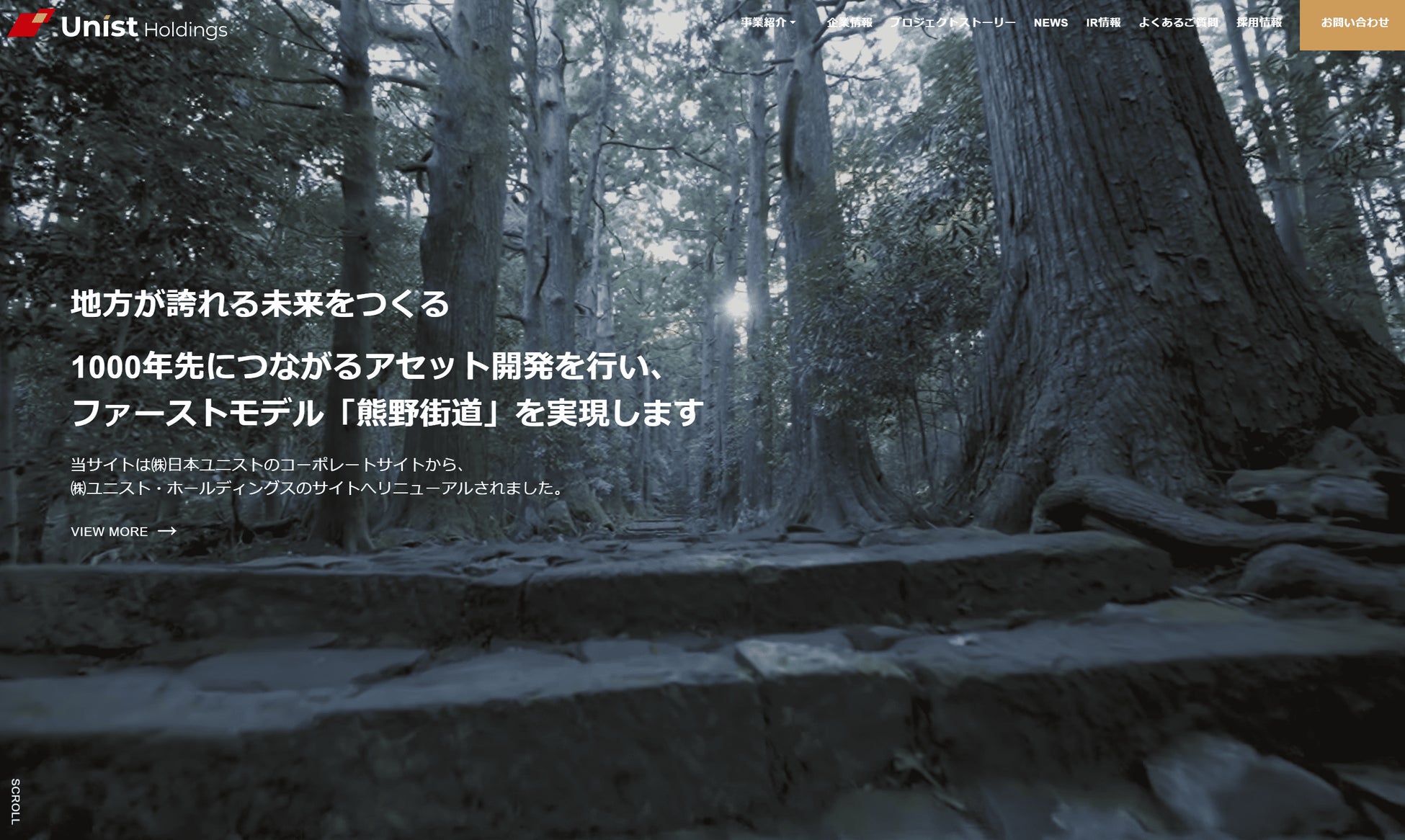 ユニストグループが実現したいことをサイト訪問者にイメージしていただきやすいように、トップページに経営理念を掲示したほか、トップページの会社紹介動画を不動産開発をイメージした都会的なものから、熊野古道で撮影した自然豊かなものへと変更。